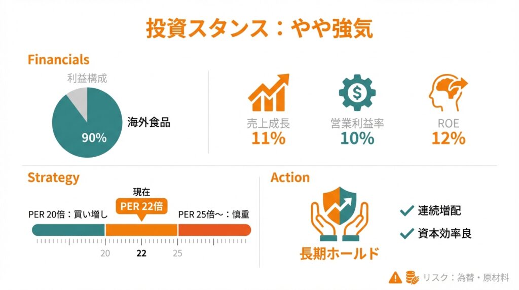 - ディフェンシブ×グローバル成長という性格を踏まえると、PER20〜25倍は妥当レンジ、30倍超は期待先行ゾーンとみられる。