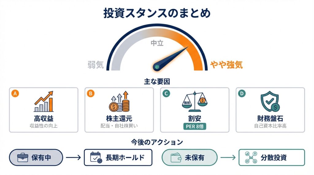 - 現状のPER 8〜9倍水準は、事業の質と収益性を踏まえると「やや割安〜妥当」であり、中長期のコア持株候補として検討余地が大きい。