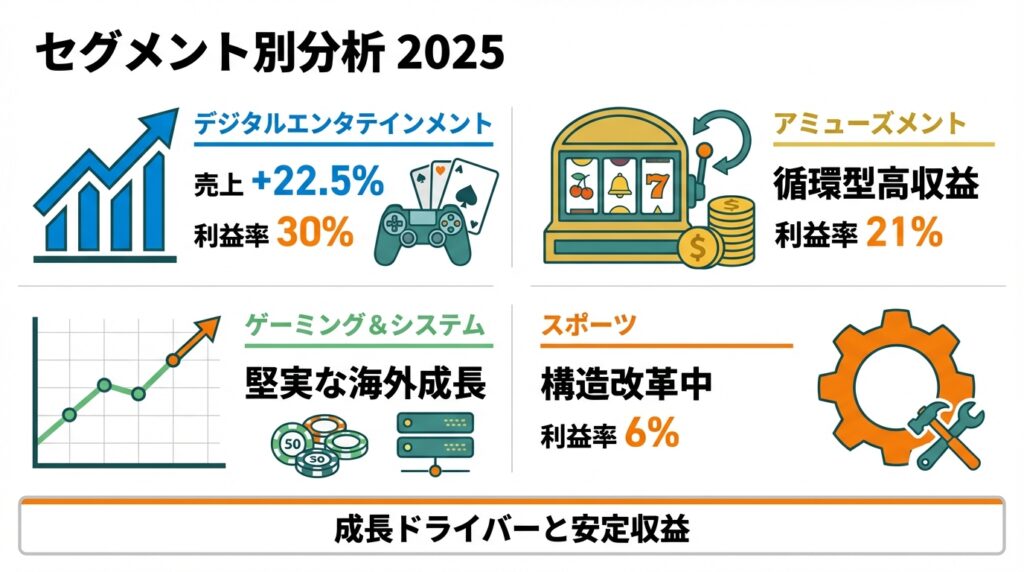 アミューズメントは日本中心で、メダルゲームやパチスロ機が主力です。規制変更の影響を受けやすく、筐体導入・入替サイクルの波もあるため、景気と規制の影響を比較的受けやすいセグメントです。