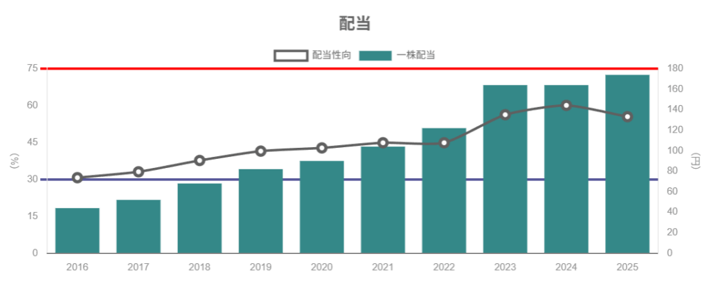 - 配当性向55%以上・総還元性向75%以上という明確な方針。
