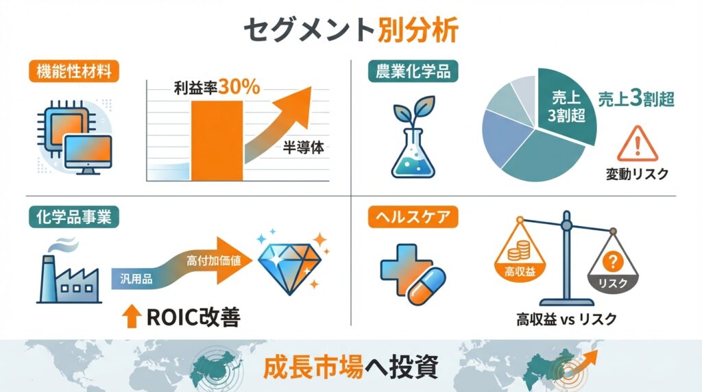 - 機能性材料とヘルスケアが高利益率、農薬がボリュームと利益を支える構造。