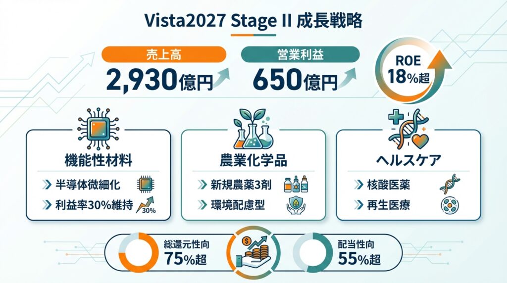 - 2027年度に売上2,930億円・営業利益650億円を目指し、機能性材料・農薬・ヘルスケアに集中投資。