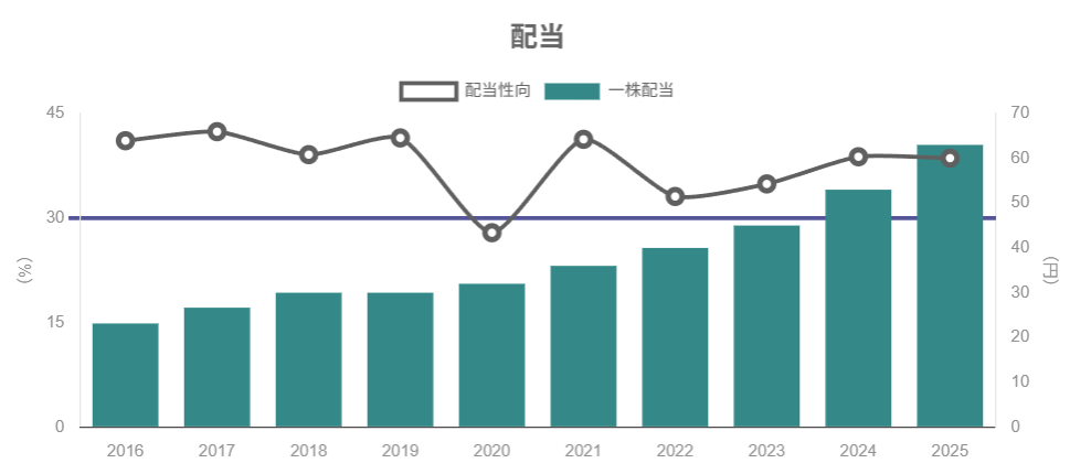 配当実績を見ると、着実な増配トレンドを維持しています。配当性向は概ね30〜40%台で推移し、2026/3期に40%まで引き上げる方針を公表済みです。