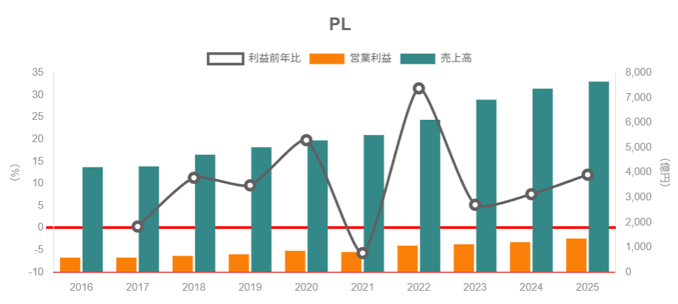 ここ数年のPERレンジはおおよそ20〜35倍程度で推移しており、足元はレンジの上限ゾーンに近い水準です。