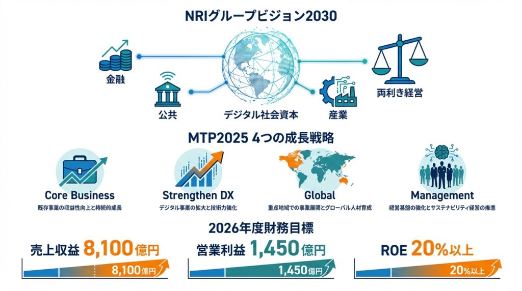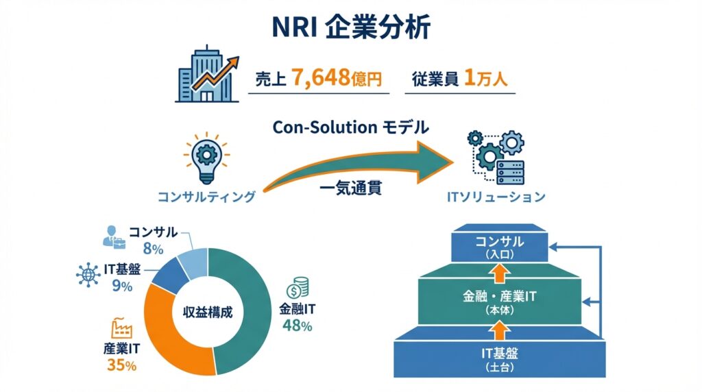 野村総合研究所(以下、NRI)は、「シンクタンク × ITソリューション」を両輪とする日本屈指の“頭脳+システム”企業です。公共政策や企業戦略を設計するコンサルティングと、その構想を金融・産業向けの基幹システムやIT基盤として実装するSI(システムインテグレーター)機能を一体運営している点が最大の特徴です。