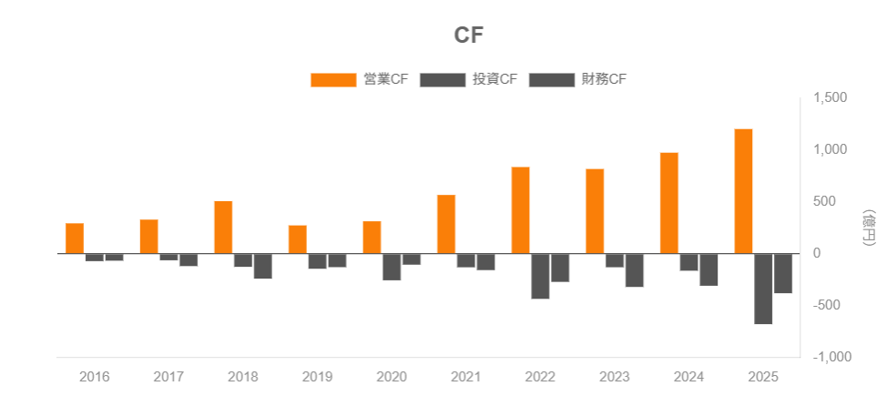 - 2021〜2025年3月期にかけて売上は約2.7倍、営業利益は約3.9倍に拡大し、営業利益率40%超・ROE 27.6%・自己資本比率75%超という“超高収益×超健全”な財務を実現。