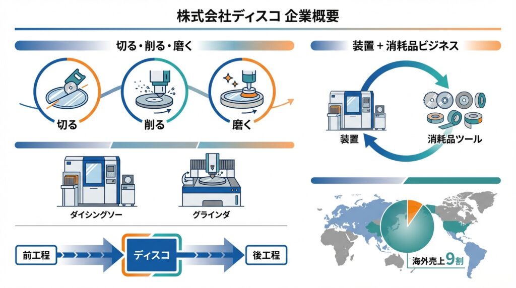 - ディスコは、ウェハの「切る・削る・磨く」に特化した世界ニッチトップであり、装置+ツール+サービスによるストック性の高いビジネスモデルを持つ。