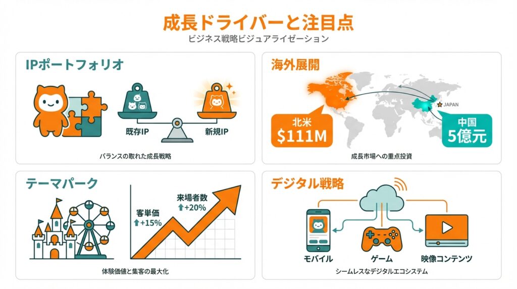 ここはまだ売上規模としては物販・ライセンス・テーマパークほど大きくありませんが、レバレッジの効きやすい成長ドライバーになりうる領域です。