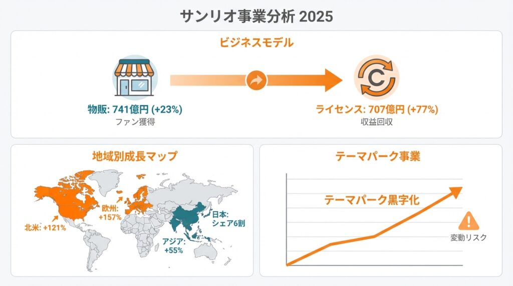 このため、サンリオにとっては「物販・テーマパークでファンを増やし、ライセンスで収益を回収する」という構造に収れんしていると考えられます。