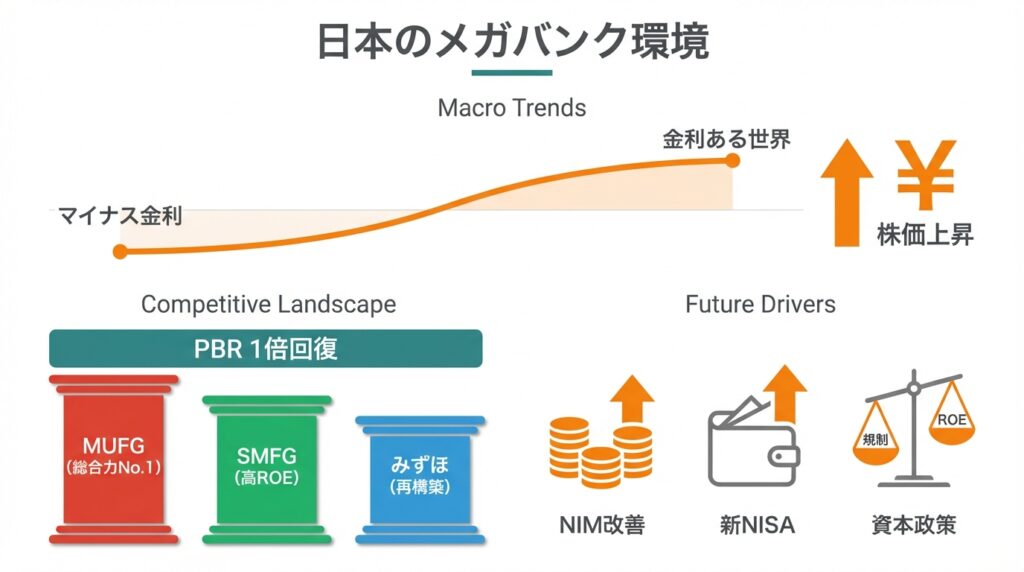 - MUFG:総資産・時価総額ともに日本最大。海外事業・証券/信託・AM/IS を含めた総合力が最も大きい。