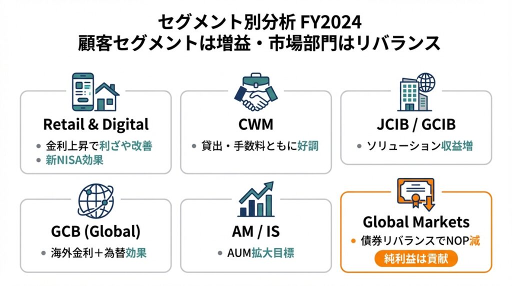 - 顧客セグメント(リテール・CWM・JCIB・GCB・AM/IS)のNOPは概ね増益トレンドで、GMのボラティリティを吸収する構造が整いつつある。