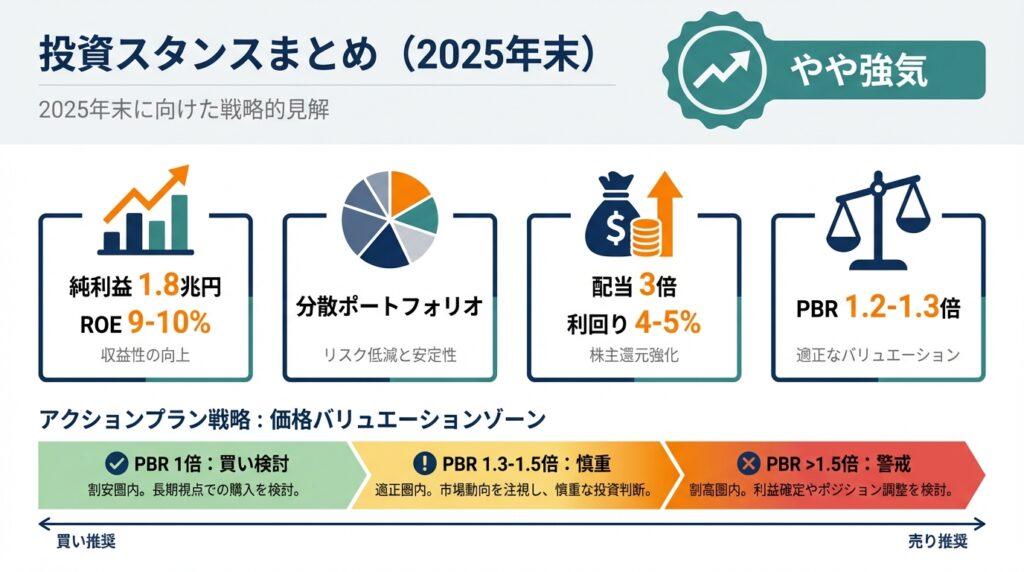 - PBR1.2〜1.3倍は「ディープバリューではないが、ROE水準を考えれば許容範囲のプレミアム」。
