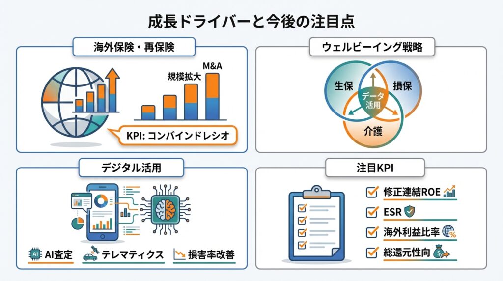 - 生保・損保・介護を跨いだデータ活用により、健康増進プログラムや予防型保険商品などを展開しようとしており、長期的には差別化要因になり得ます。