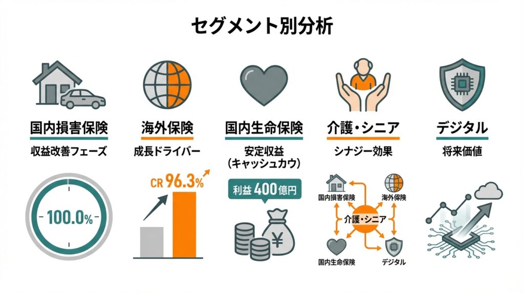 - 国内損保・生保・介護が「安定基盤」としてグループを支えている。