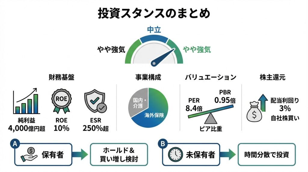 - 東京海上など他の金融株と比較しつつ、ポートフォリオのディフェンシブ枠・高還元枠として、少しずつ時間分散で組み入れるスタンスが考えられます。