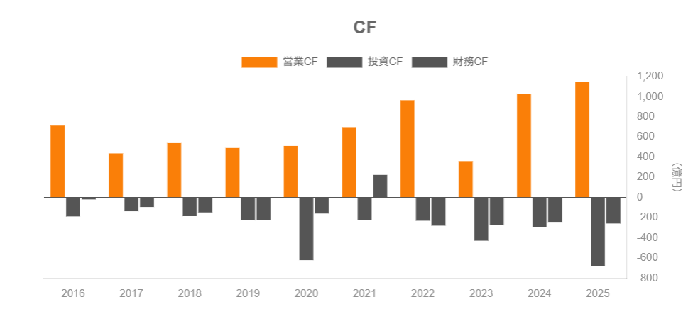 - 営業CFは厚く、FCFも概ねプラスを維持しつつ、新研究開発拠点など将来の成長に向けた投資を拡大している。