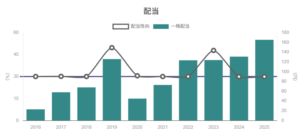 - 配当は「配当性向30%以上」を掲げ、業績拡大とともに増配しているが、利回りは1%未満であり、成長+再投資重視の投資家向けの銘柄である。