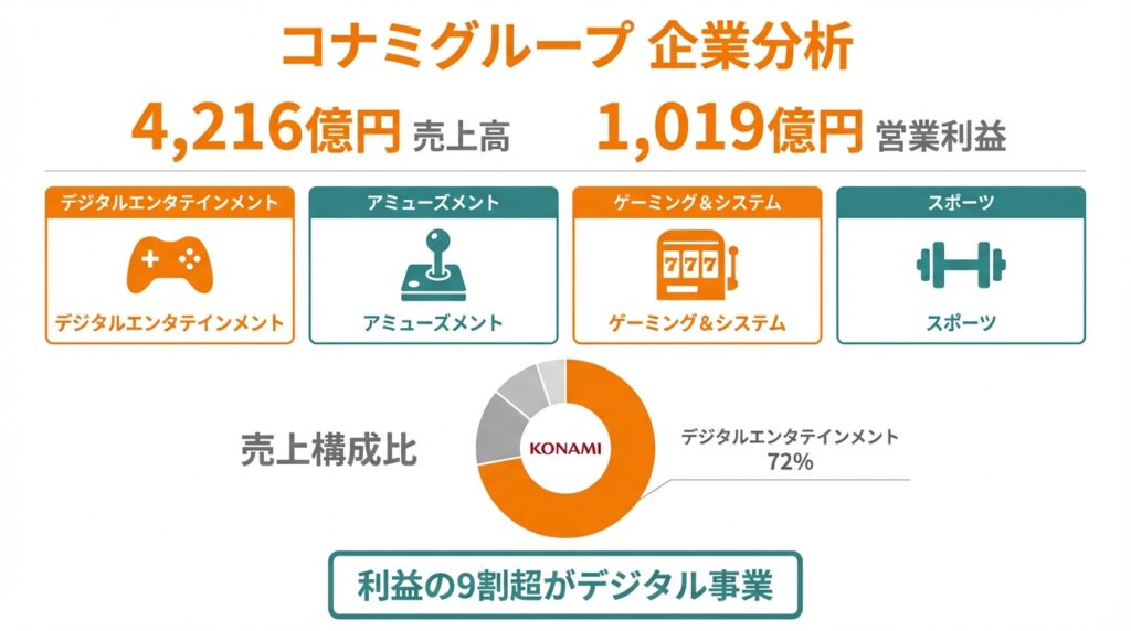 - コナミは4事業を持つが、売上の約7割・利益の9割超をデジタルエンタテインメントが稼ぐゲームIP企業である。