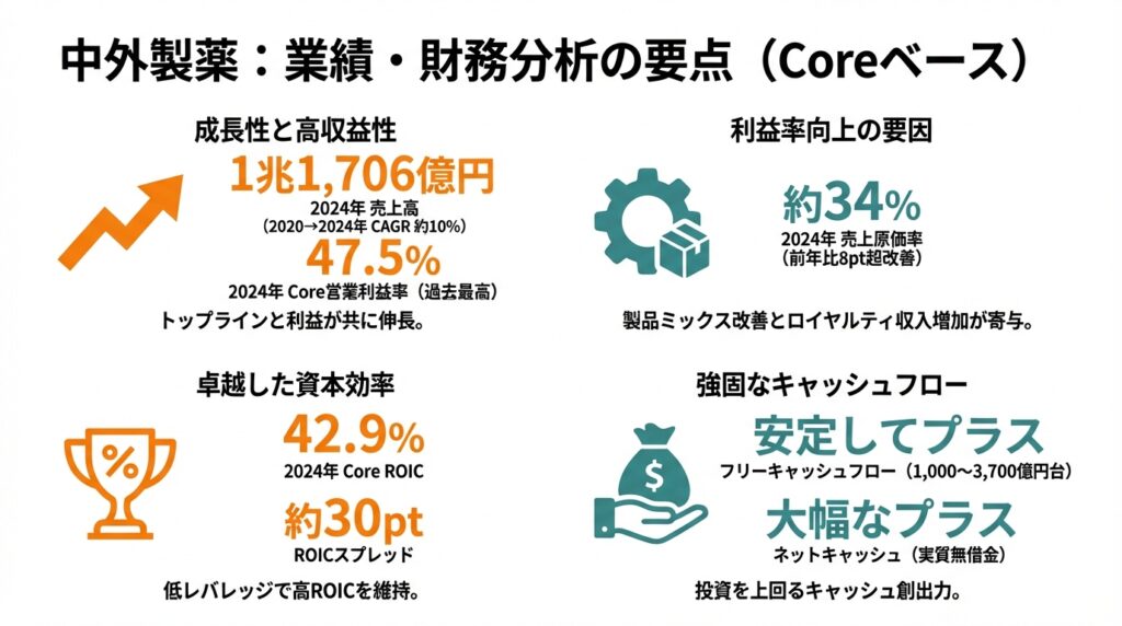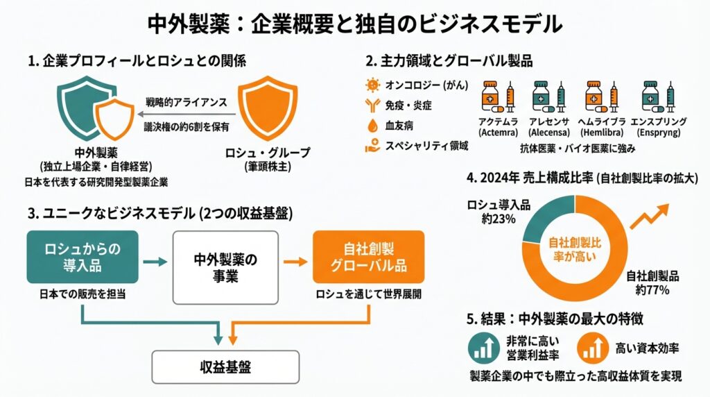 - 中外製薬は、自社創製グローバル品とロシュ連携を軸に、営業利益率40〜50%台・ROIC30〜40%台という非常に高い収益性を持つ研究開発型製薬企業。