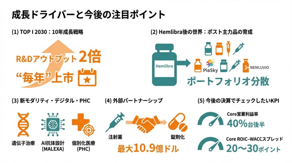 - 自社創製グローバル品×ロシュ連携による高マージン海外収益と、日本市場での導入品ビジネスという二重の収益基盤を持つ点は、防御力と成長性の両面で魅力。