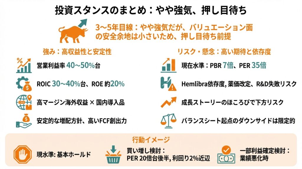 - すでに大きなポジションを持っている場合は、業績トレンド(Hemlibra・新製品群の成長、Core営業利益率)に明確な悪化が見られた際に、一部利益確定も選択肢となります。