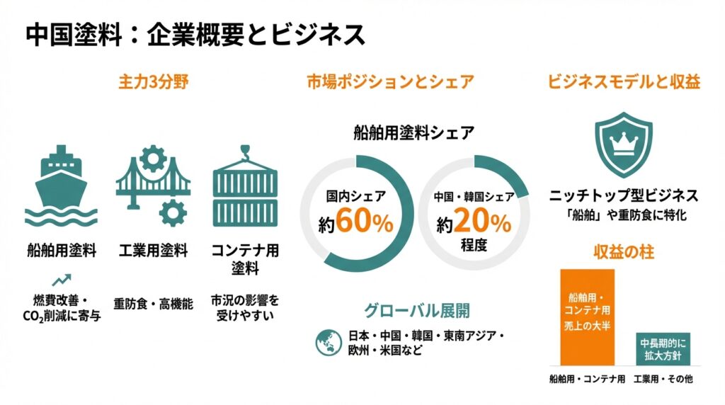 - 中国塗料は船舶用塗料で国内シェア約6割を持つグローバル・ニッチトップであり、IMO環境規制や燃費改善ニーズを追い風に成長中。