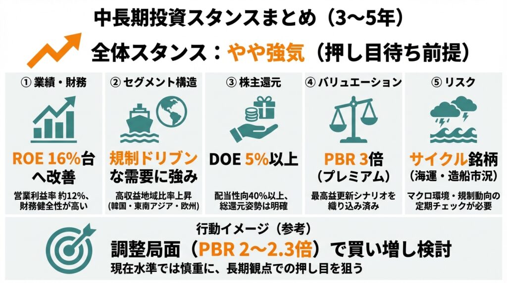 ここまでを踏まえた、中長期(3〜5年)投資家としてのスタンスを整理します。