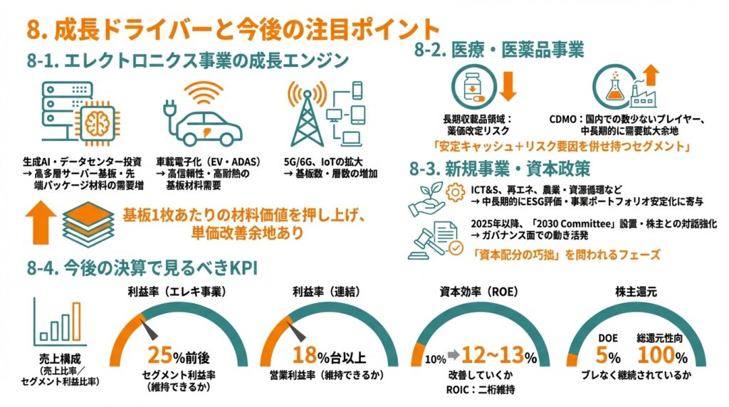 - 半導体サイクル・為替・薬価改定・減損・ガバナンスなど、複数のリスク要因があり、短期的な業績・株価の振れは覚悟が必要。