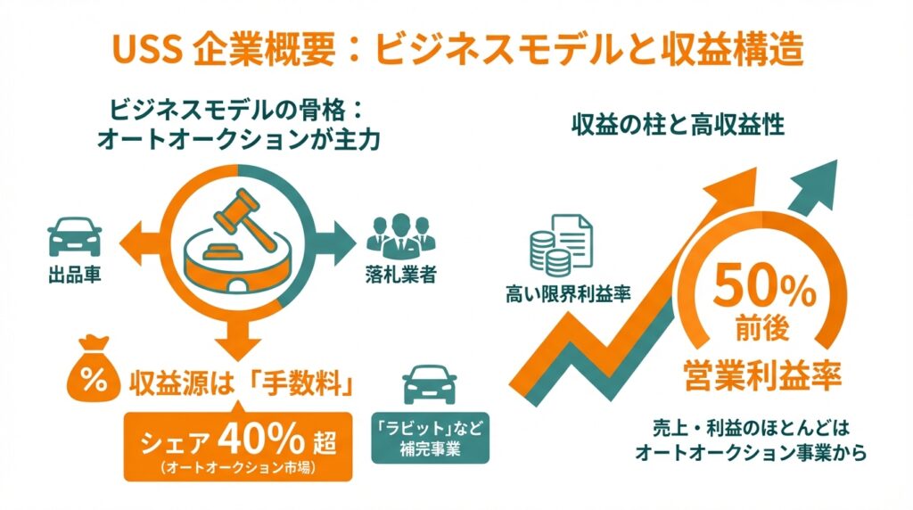 • USS は日本最大の中古車オークション運営会社で、市場シェア約4割超、50%を目標とする圧倒的プレイヤー