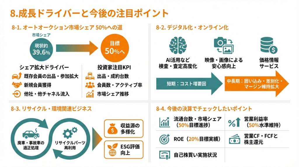 「オークション×リサイクル」のシナジー(事故車の取扱い・部品の再利用など)が期待される分野です。