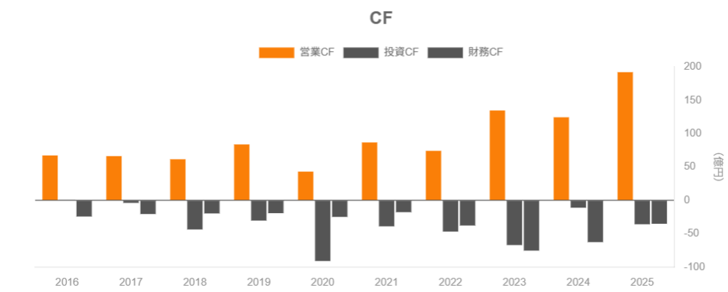 自己資本比率は2025年3月期時点で81.3%と非常に高く(総資産1,305億円に対して純資産1,061億円)、財務レバレッジをほとんどかけていないにもかかわらずROE14%台を維持しているのが特徴です。