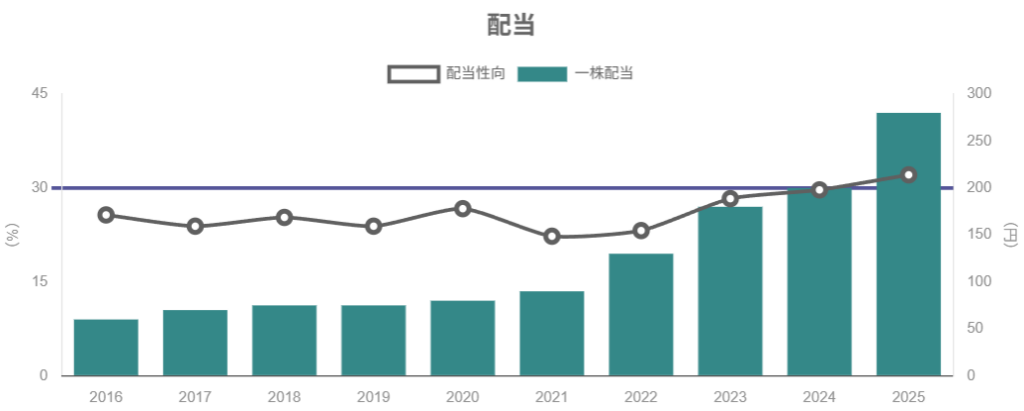 • 配当性向30%前後+大型自社株買い・株式消却実績があり、今後も余剰資本の還元余地が大きい。