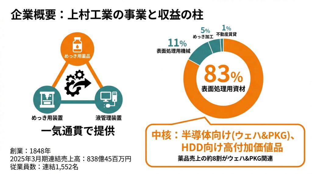 1. 上村工業は、半導体パッケージ基板・HDD向けめっき薬品を主力とする高収益ニッチプレーヤーで、売上の8割以上を表面処理用資材(薬品)が占める。