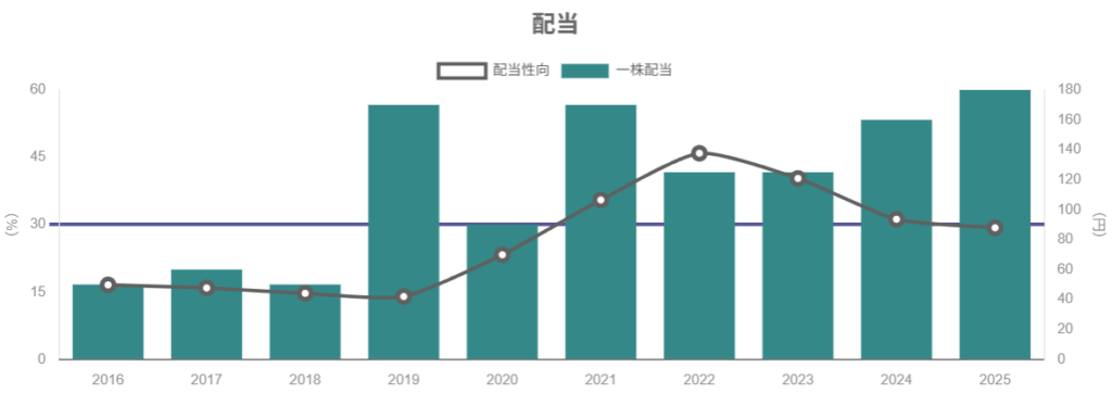 - 配当性向40%以上・総還元性向55%以上を掲げ、実際には増配+自社株買い+消却を組み合わせた強い株主還元を続けている。