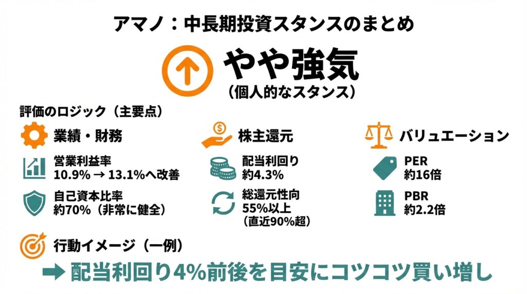 以上を踏まえ、中長期投資家の視点から現在のアマノを総合評価すると、個人的なスタンスとしては