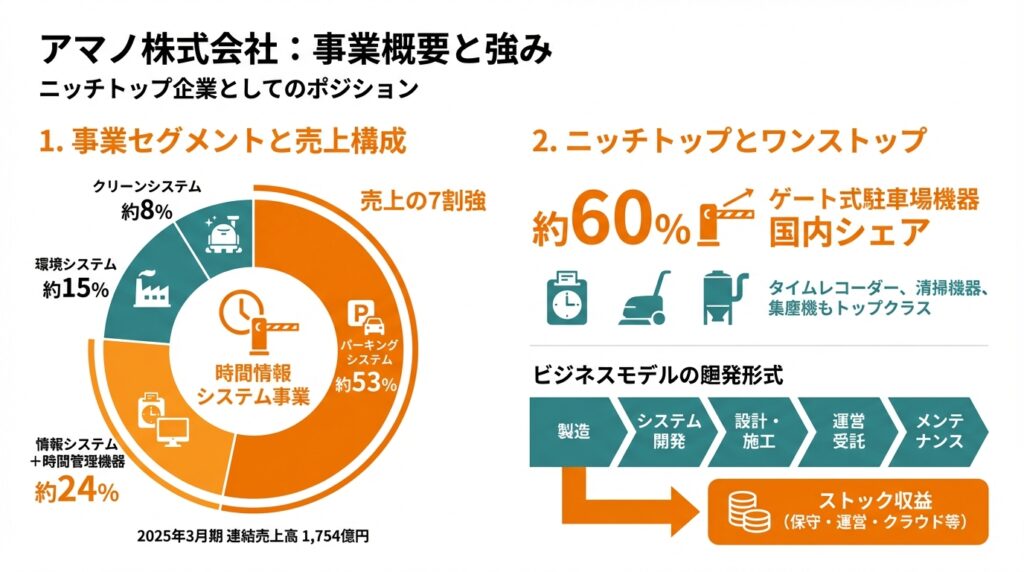 - アマノは時間情報・パーキング・環境・クリーンの4事業を持つ“ニッチトップ”で、複数の領域で国内トップシェアを有する。