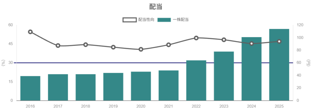 - 配当はDOE5%・配当性向50%を目安とした方針に基づき、増配基調。利回りは2%前後で、「高配当株」というよりは成長+安定配当のバランス型銘柄です。