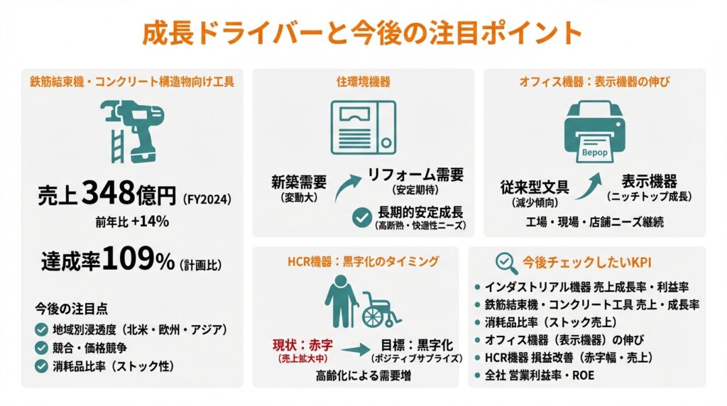 - インダストリアル機器の中でも、鉄筋結束機などコンクリート構造物向け工具が高成長・高収益の中核となっており、今後も中期成長の鍵を握ります。