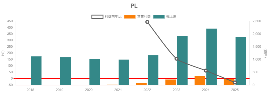 - 2024年3月期まで高成長・高利益率を達成した一方、2025〜2026年度は特需終了・中国需要減退・先行投資負担で減益局面にある。