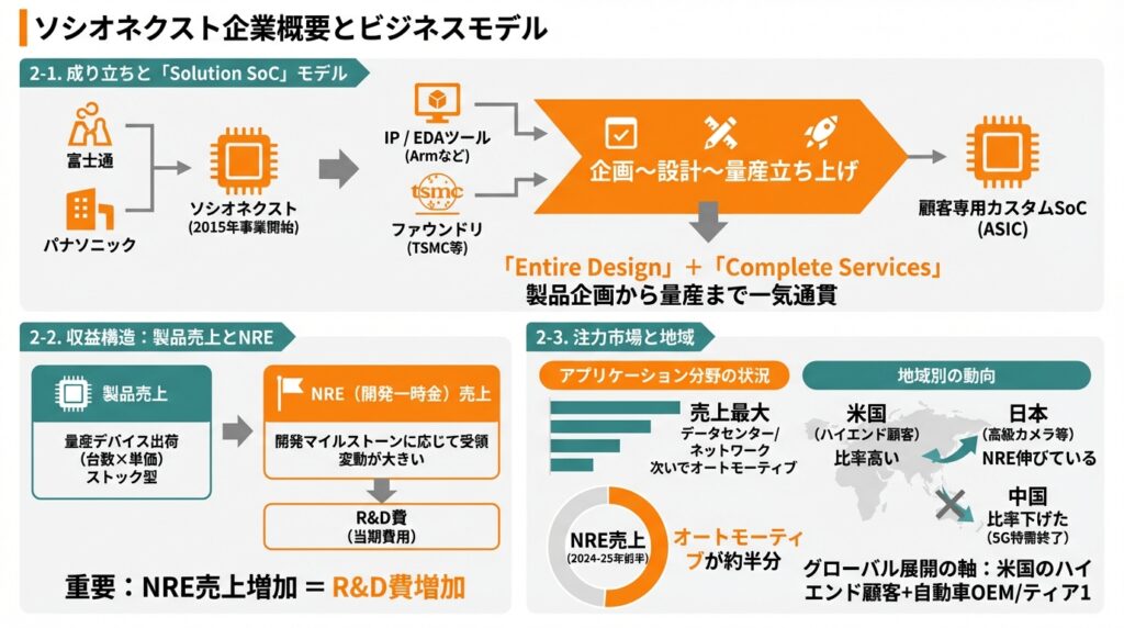 - ソシオネクストは、Solution SoCモデルでNRE+量産売上を組み合わせるファブレスSoC専業企業であり、先端プロセス・オートモーティブ・データセンター向けに強みを持つ。