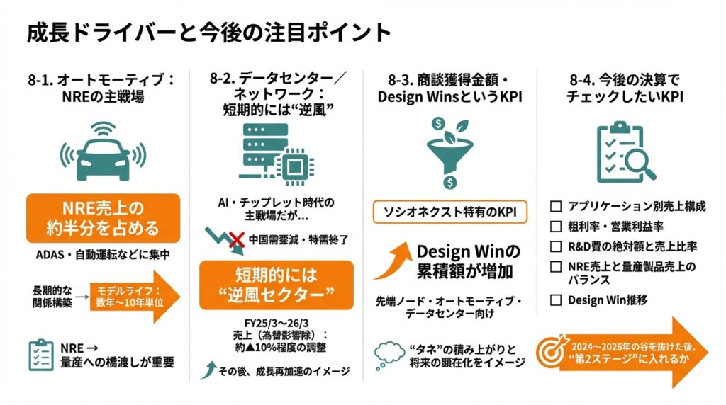 - 中長期投資家は、短期業績よりもDesign Win・オートモーティブ量産・NREと製品売上のバランスに注目し、「谷の局面の長さ」と「次の成長フェーズの厚み」を見極める必要がある。