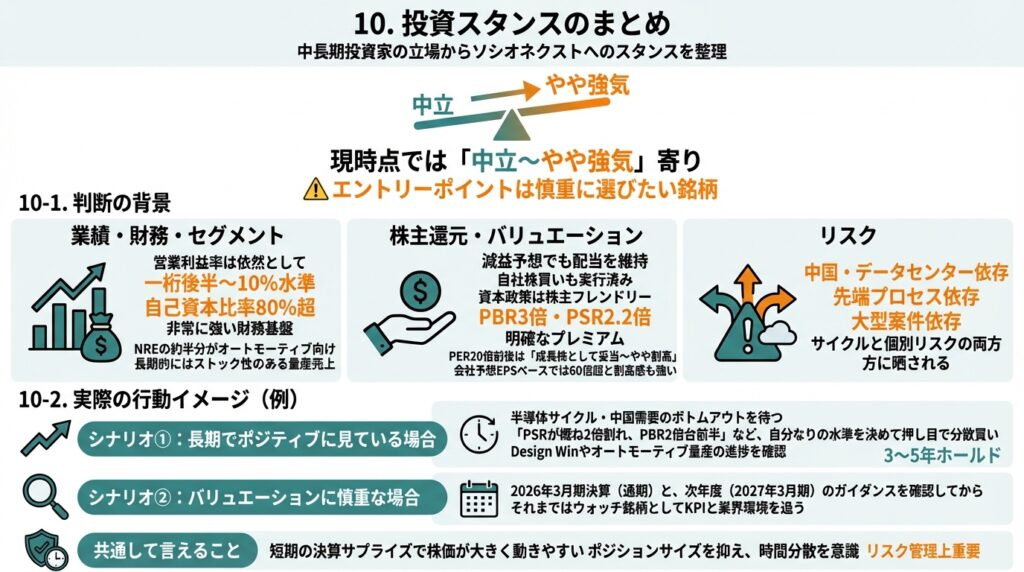 ここまでを踏まえ、中長期投資家の立場からソシオネクストへのスタンスを整理すると、