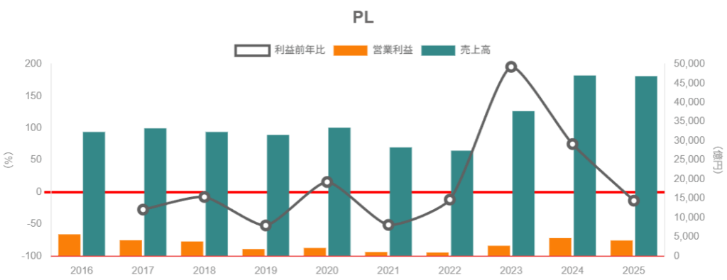 - 2025年度は売上微減・利益減少と、2024年度の高水準からやや一服している。