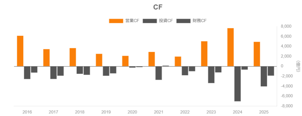 - 財務体質は自己資本比率50%超・ネットキャッシュと極めて健全で、年間数千億円規模のフリーCFと増配・自社株買いが続いている。