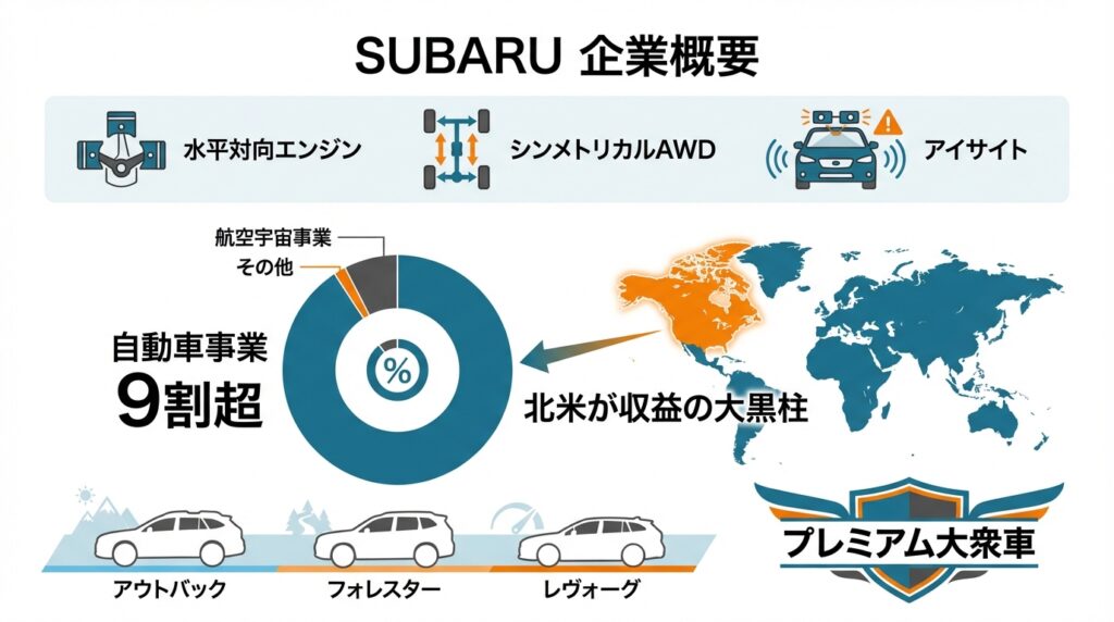 - SUBARUは、米国向けSUV・AWD車を主力とする中堅完成車メーカーで、自動車事業が圧倒的な利益源。
