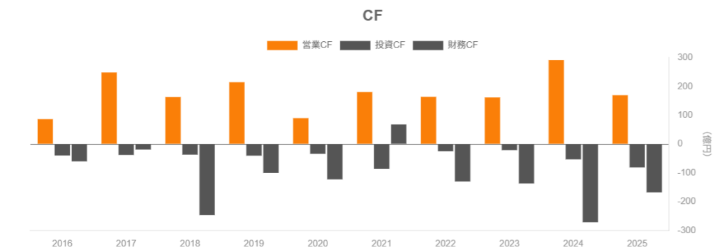 - 2024年度の営業CFマージン約14%・FCF約240億円が一時的か、再現性があるか
