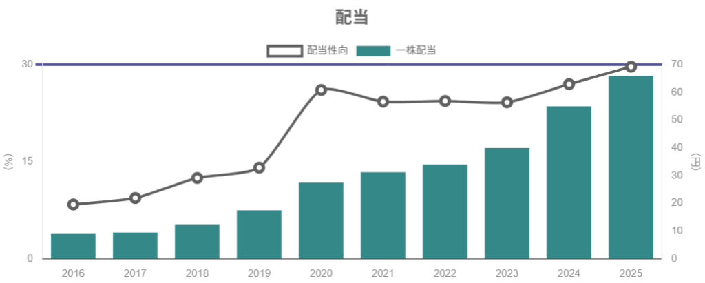 2026年3月期予想ベースで配当利回り3%台半ば・配当性向30%前後と、