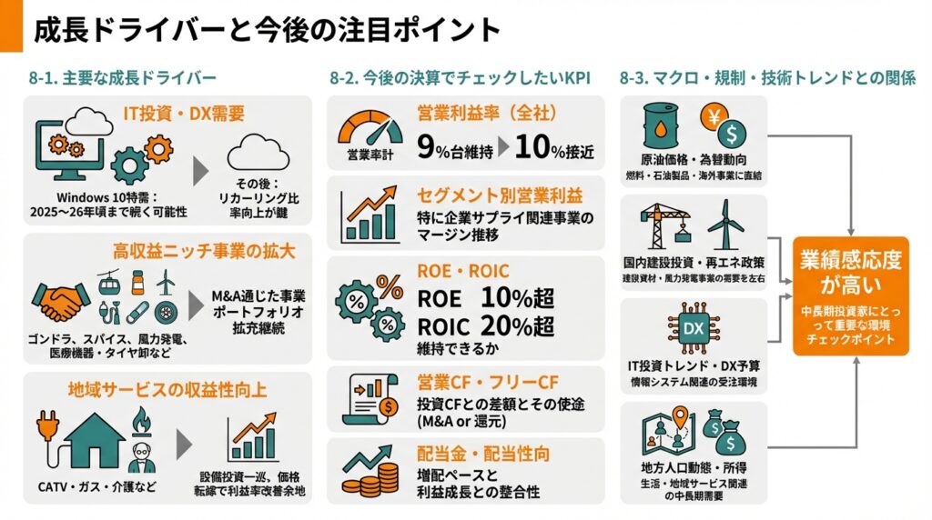原油価格・建設需要・為替・政策などの外部要因による業績ブレには注意が必要。