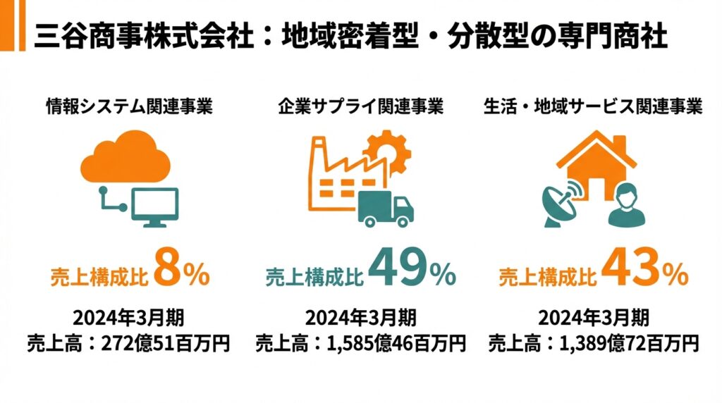 • 三谷商事は、情報システム・企業サプライ・生活・地域サービスの3セグメントを持つ、