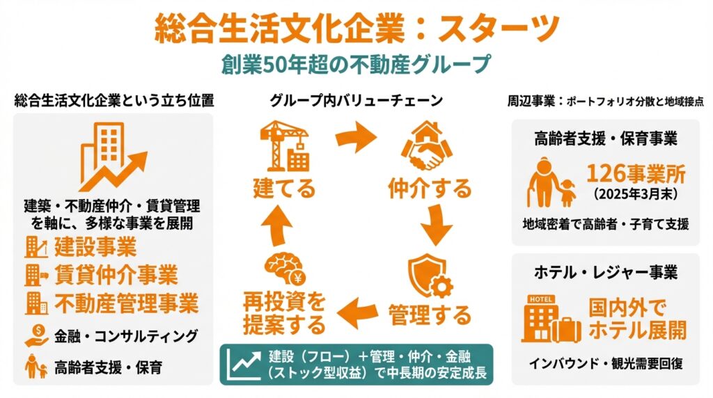 スターツは、創業50年超の不動産グループで、建築、不動産仲介、賃貸管理を軸に、金融、高齢者支援・保育、ホテル、出版、物販・文化事業などを展開する「総合生活文化企業」と位置付けています。